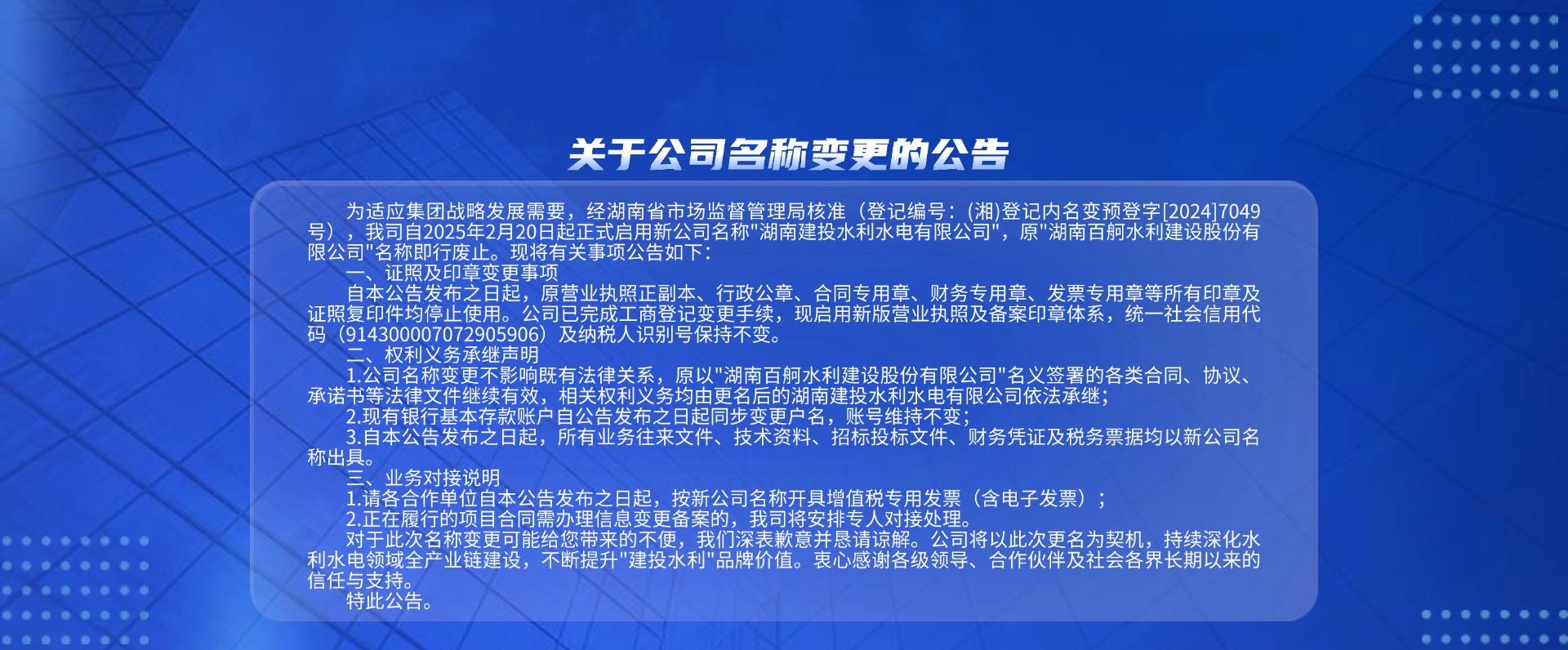 2022年9月,原湖南建工集團(tuán)與原湖南交水建集團(tuán)合并組建湖南建設(shè)投資集團(tuán)。原雙方集團(tuán)旗下的湖南百舸水利建設(shè)股份有限公司和湖南建工集團(tuán)水利水電工程公司合并為湖南建投百舸水利公司,實(shí)行兩塊牌子(百舸水利、建工水利)管理,為湖南建投集團(tuán)唯一水利建設(shè)企業(yè)。2024年9月,公司正式更名為湖南建投水利水電有限公司(簡(jiǎn)稱湖南建投水利),統(tǒng)籌管理“百舸水利”“建工水利”“施工公司”“疏浚公司”等子品牌。